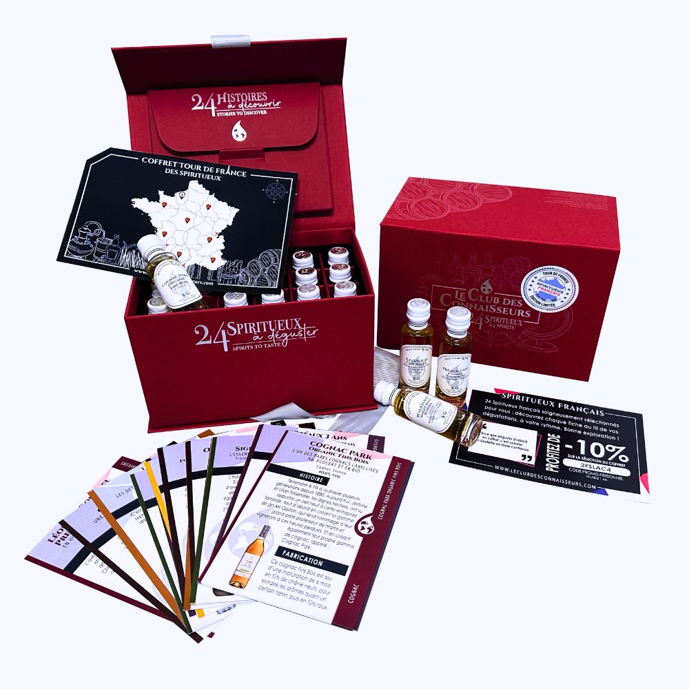 Vivez une immersion totale au sein des distilleries de France, grâce à ce coffret Tour de France en 24 spiritueux français. C’est l’embarquement pour une aventure gustative à travers le terroir français.